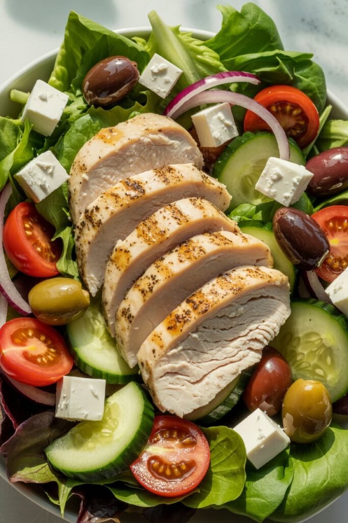 The combination of grilled chicken, feta cheese, and olives makes it flavorful and satisfying.