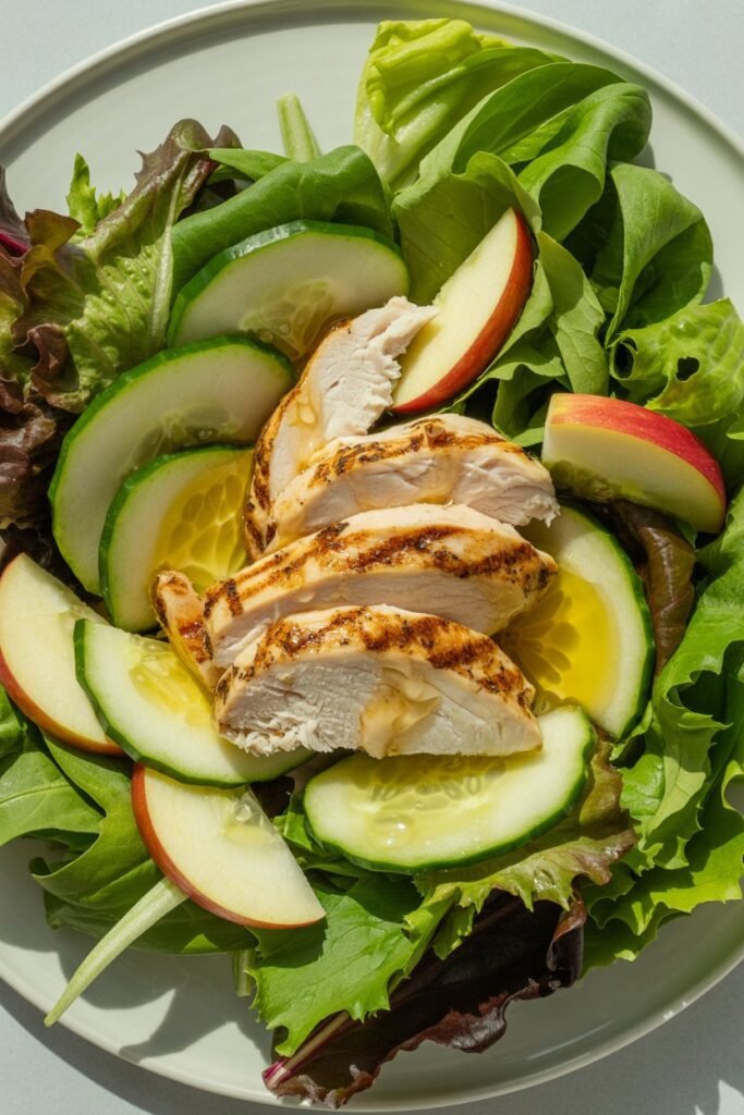 Start by washing and drying the mixed greens, then place them in a large bowl. Slice the grilled chicken into bite-sized pieces and arrange them evenly over the greens.