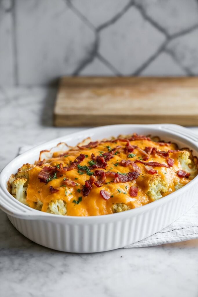 You get all the comfort of a classic potato bake without the carbs. The cauliflower soaks up the creamy cheese sauce, the bacon adds crunch and flavor, and it’s filling enough to serve as a main or an easy side.