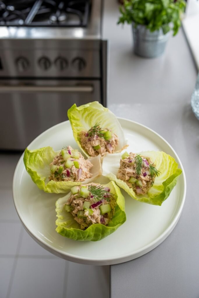 Spoon the tuna mixture into each leaf. You and I both know it is easy to overfill, so I usually start with a heaping tablespoon per leaf and adjust as needed. Roll them up and serve immediately for a fresh, crunchy bite.
