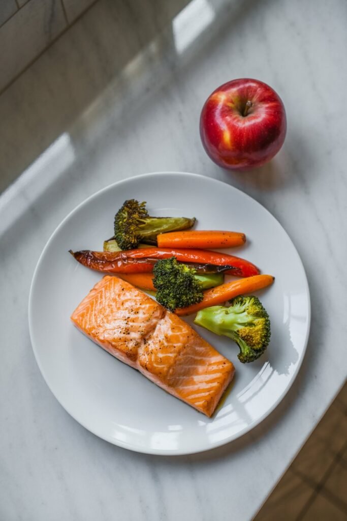 I usually roast extra vegetables so I can use them as snacks the next day. Adding salmon gives omega-3s and protein, which keeps me full and nourished.