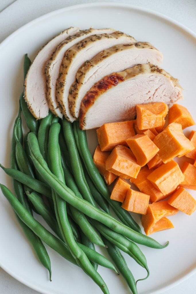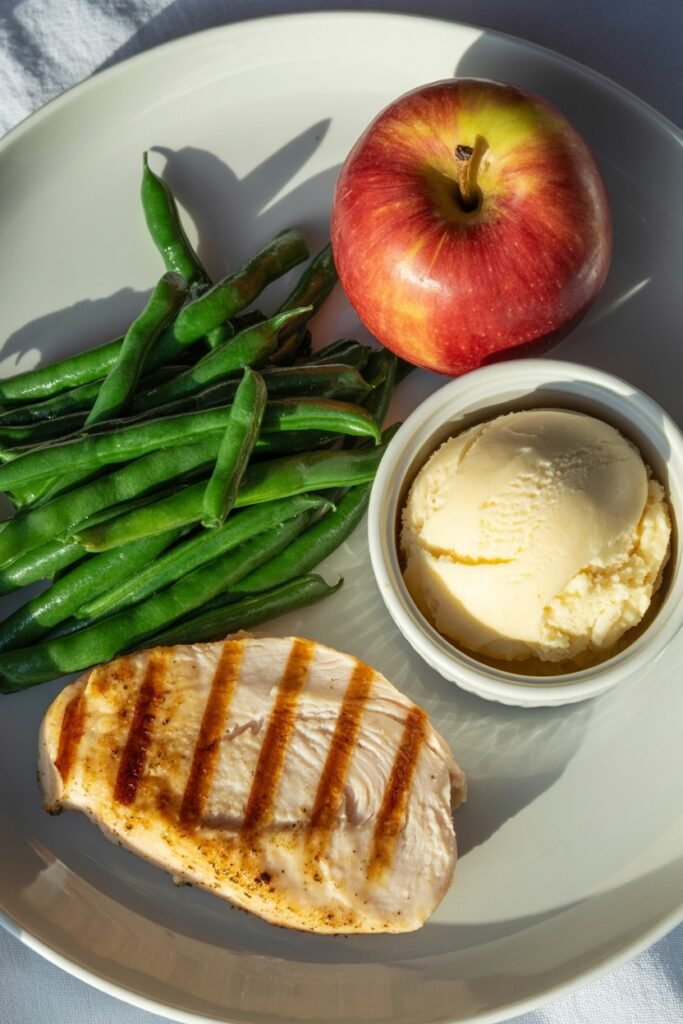 I bake or grill the meat with light seasoning, steam the green beans just enough to stay crisp, and enjoy the small dessert at the end.