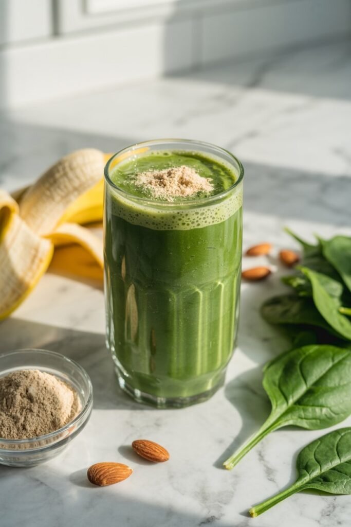 - Smoothie: 1 cup unsweetened almond milk, 1/2 banana, 1/2 cup spinach, 1 scoop protein powder