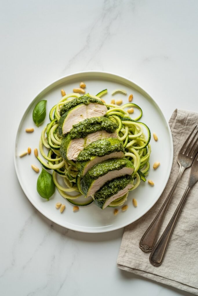 Light, fresh, and bursting with flavor — this paleo dish combines tender chicken and zucchini noodles with a bold, herby pesto that’s completely dairy-free.