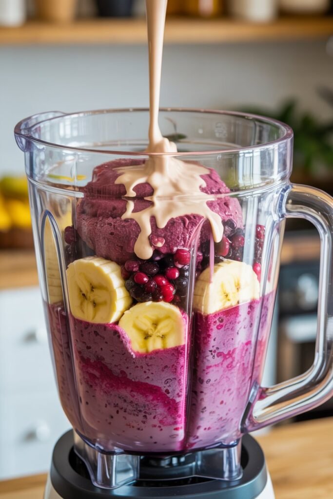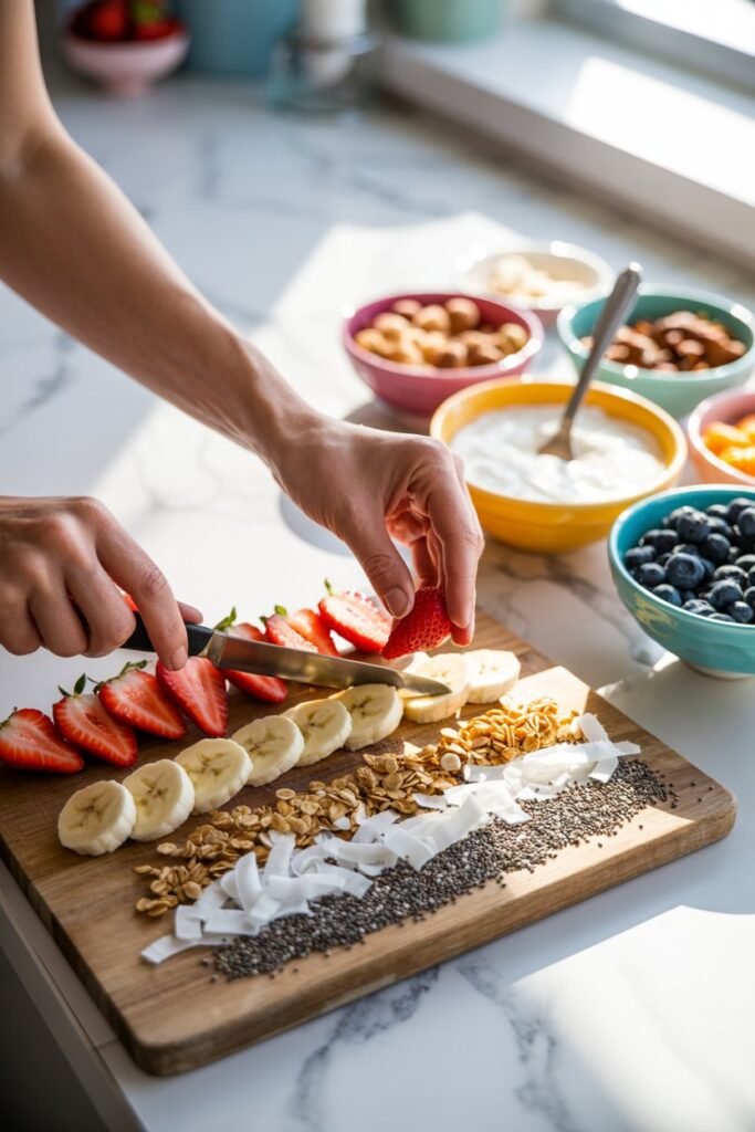 While the base blends, prepare your toppings. Slice fresh fruits such as strawberries, bananas, and blueberries, and gather crunchy ingredients like granola, oats, or seeds.