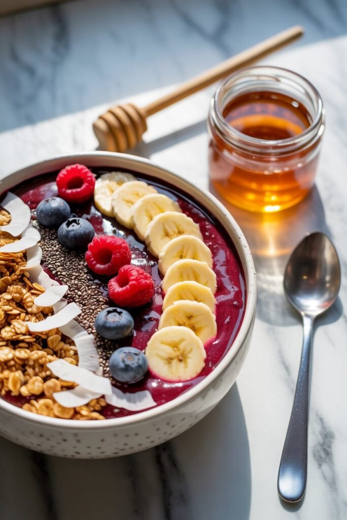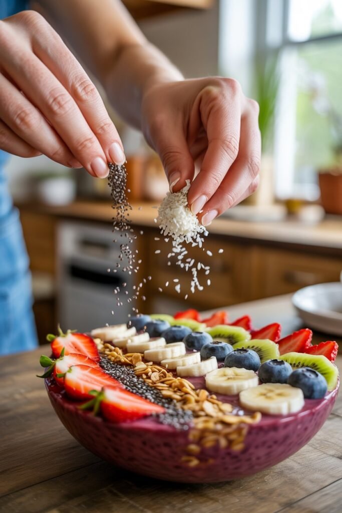 Toppings are where the fun begins. I always add a mix of textures such as granola, chia seeds, and coconut flakes to make every bite interesting and boost nutrition.