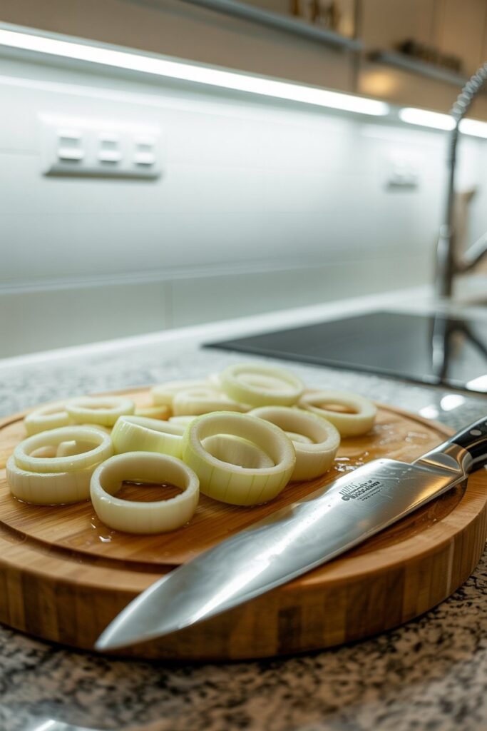 Peel your onions and slice them thinly—either into rings or half-moons, depending on how you want to use them. I like to take a moment to gently separate the slices so every piece gets coated evenly later.