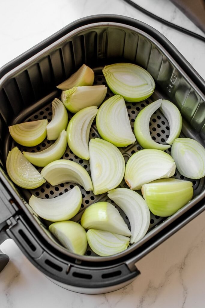 Give your air fryer basket a light spritz of oil—just enough so the onions don’t stick. Then, lay your coated onion slices in a single layer.