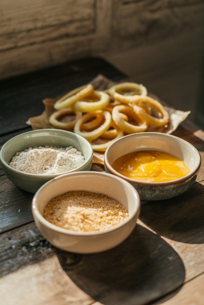 Now comes the fun part: take each onion slice and give it a little spa treatment—dip it first in the seasoned flour, then into the egg, and finally coat it with breadcrumbs. Shake off any extra crumbs so every bite is perfectly crunchy. I promise, this part is oddly satisfying!