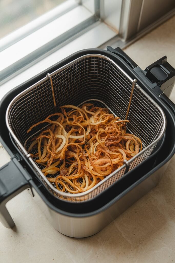 Pop the basket into your air fryer and cook at 375°F (190°C) for about 8–10 minutes. Halfway through, give the basket a good shake so the onions crisp evenly on all sides.
