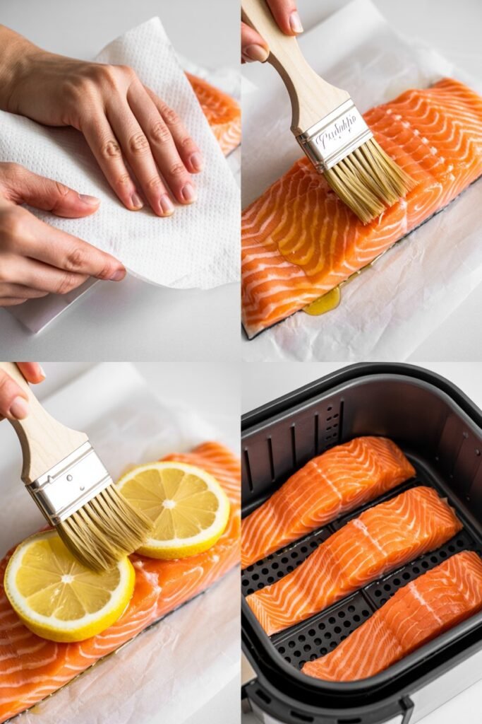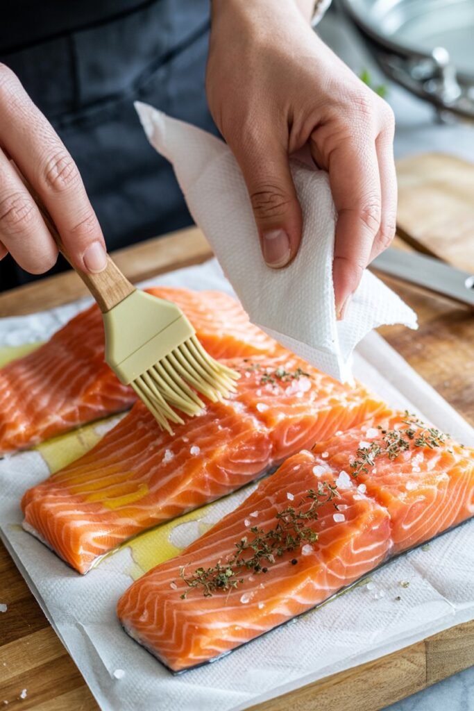 I always start by patting my salmon dry with paper towels. It might seem small, but removing that extra moisture makes a huge difference—you’ll get a crispier exterior instead of a soggy finish.