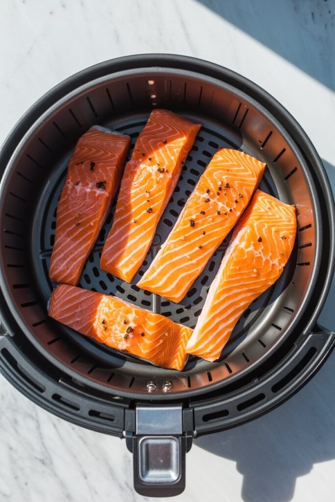 I place the salmon skin-side down in the basket, making sure the fillets aren’t crowded. I like to give them a little space so the hot air can circulate and cook them evenly.
