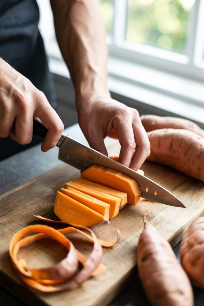 Peel or leave the skin on your sweet potatoes. Cut them into ¼-inch thick fries for optimal crispiness. I like to keep them uniform so they cook evenly. - Step 2 – Soak for Crispiness (Optional but Recommended)