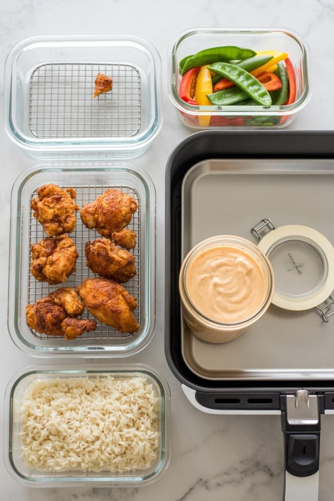These bowls store surprisingly well as long as you keep everything separate. If you mix everything together, the cold sauce softens the chicken and the textures blur together.