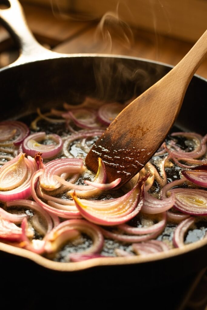 In a small skillet, I heat olive oil over medium heat and sauté the thinly sliced red onions for 3-4 minutes until soft and slightly caramelized.