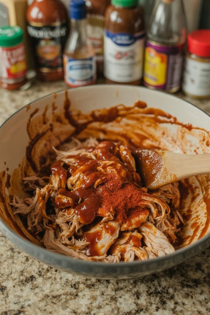 I toss the shredded chicken with BBQ sauce, smoked paprika, and Worcestershire sauce in a large bowl until it’s all coated.