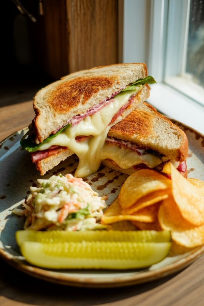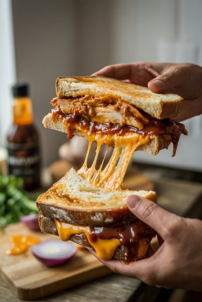Tender shredded chicken tossed in smoky BBQ sauce, melty cheese, caramelized onions, and garlic-buttered sourdough come together to create a sandwich that is bold, flavorful, and deeply satisfying.