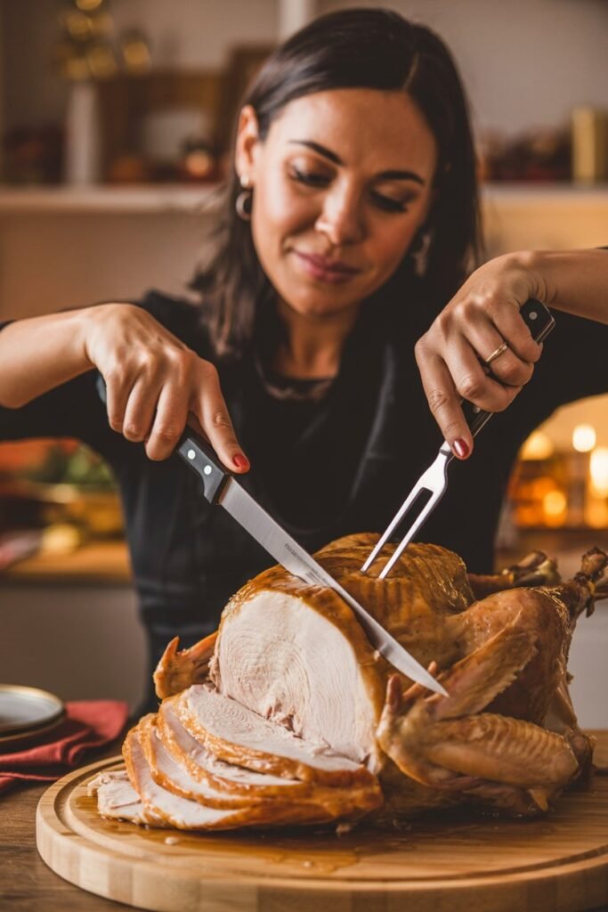 Pro Tip: Always carve the turkey on a sturdy surface with a sharp knife — a carving fork helps steady the meat for clean slices.
