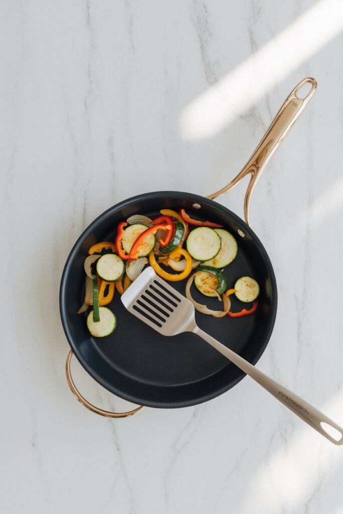 From sautéing veggies to simmering sauces, this versatile skillet combines performance with sleek design. Its black finish with gold accents makes it an instant countertop statement piece.