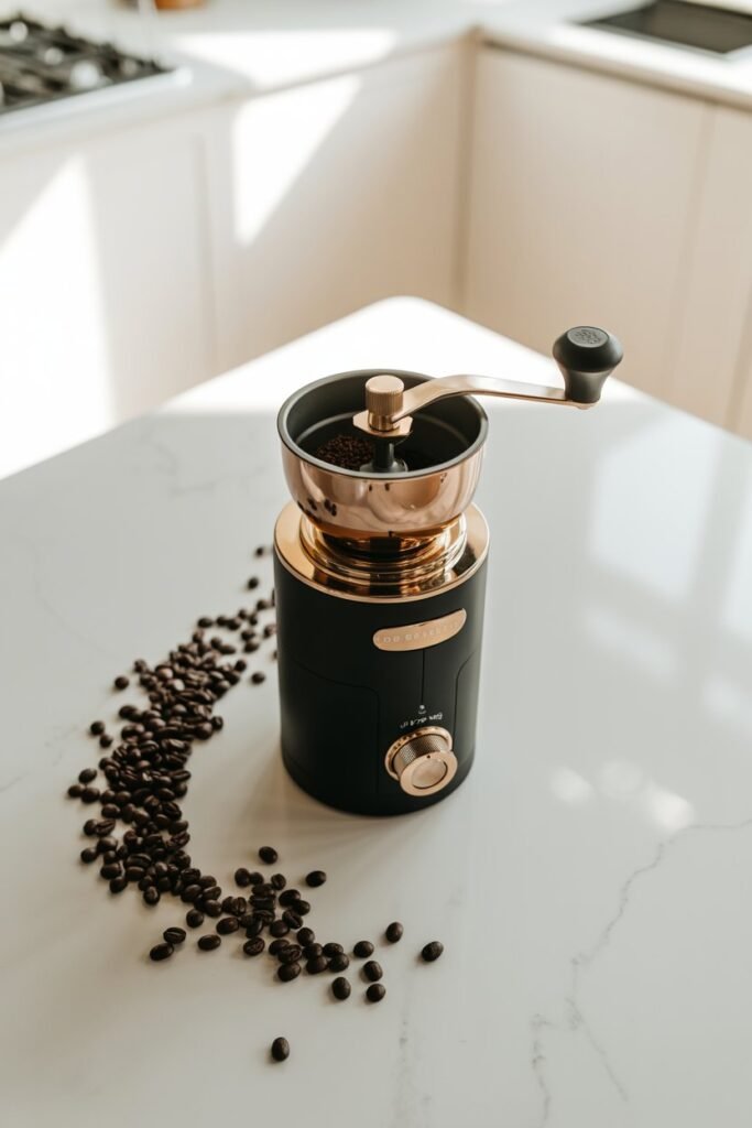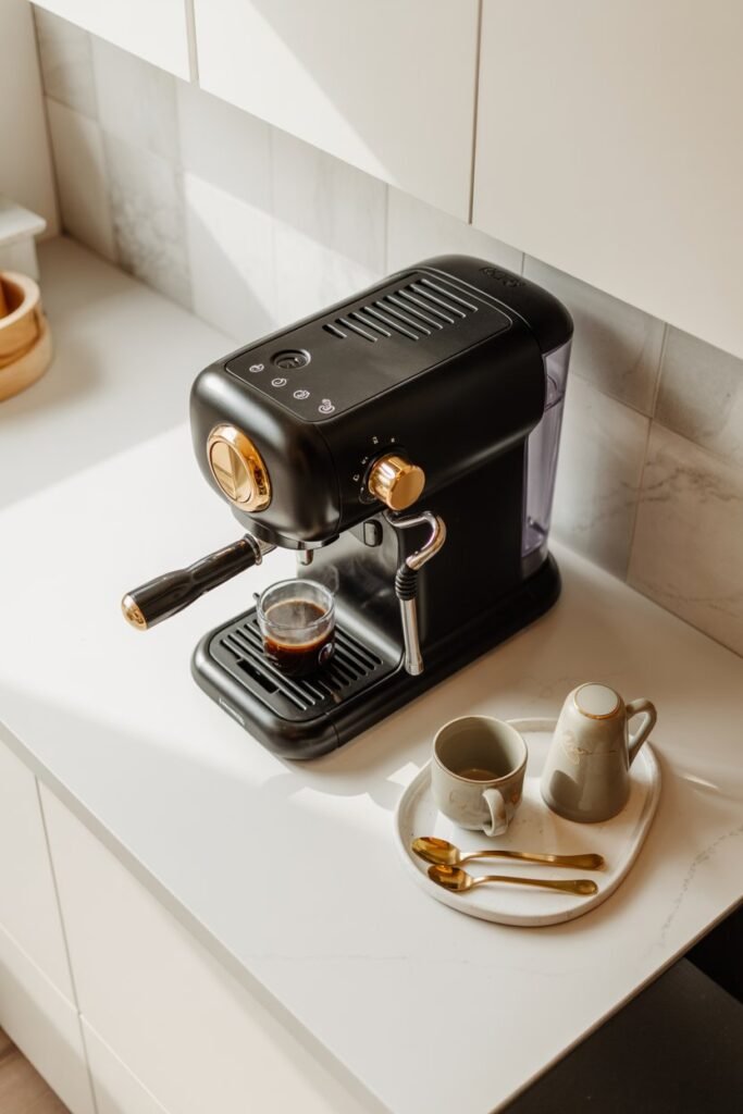 Start your mornings like a barista with a black espresso machine finished with subtle gold accents. It doesn’t just make coffee; it makes a statement.
