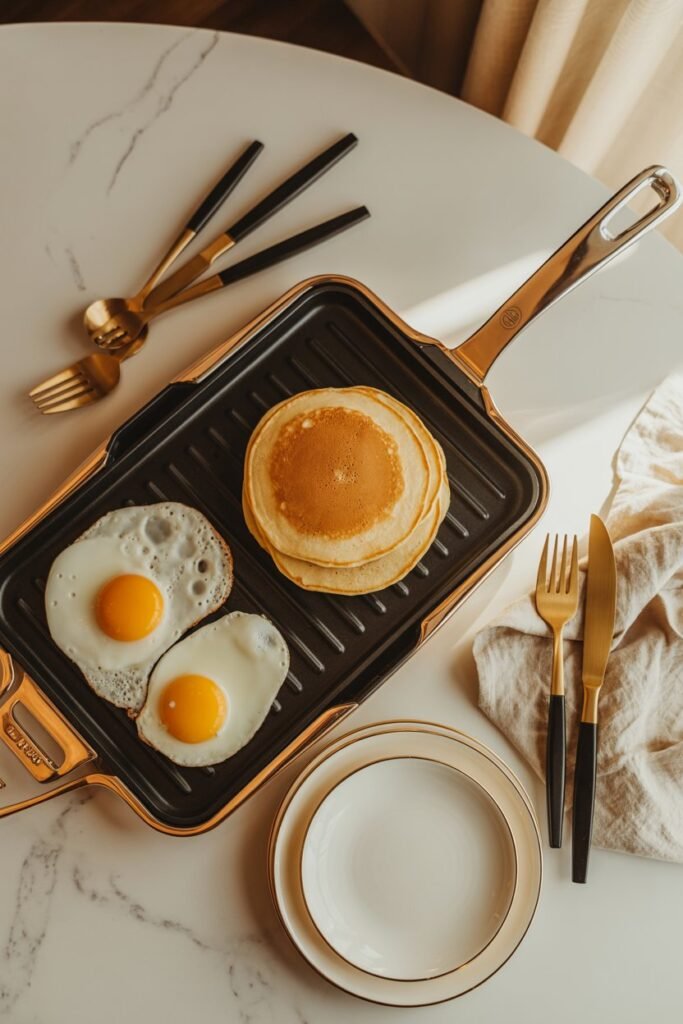 Styling: Pair with matching black and gold spatulas or serving trays. Display a small stack of fresh plates nearby to make breakfast prep feel polished.