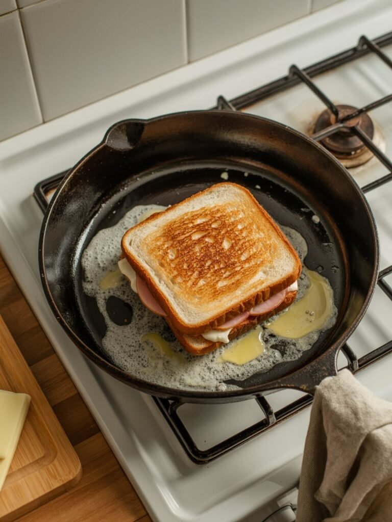 Once the bottom is golden and crispy, I carefully flip the sandwich. I keep the heat moderate and check the underside to ensure it browns evenly.