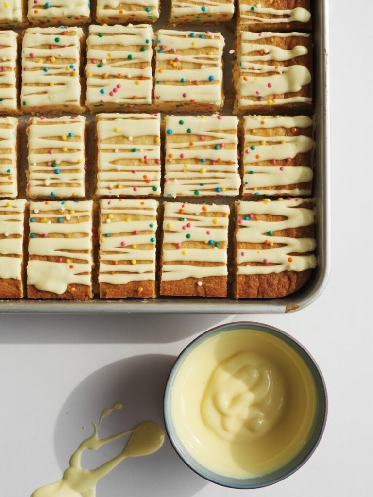 Melt the white chocolate chips until smooth and drizzle over the top. Add extra sprinkles as desired. - Let the Bars Set