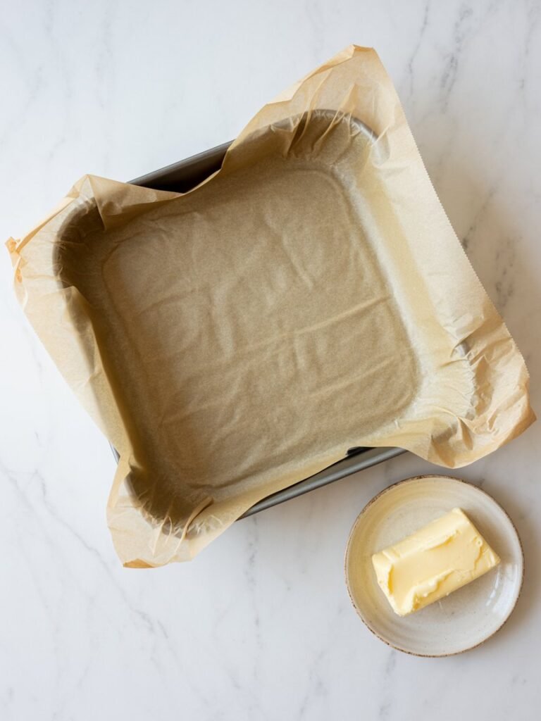 Line an 8×8 or 9×9 pan with parchment paper. Leave some overhang on the sides so you can easily lift the bars out later. Lightly grease the parchment so the bars don’t stick.