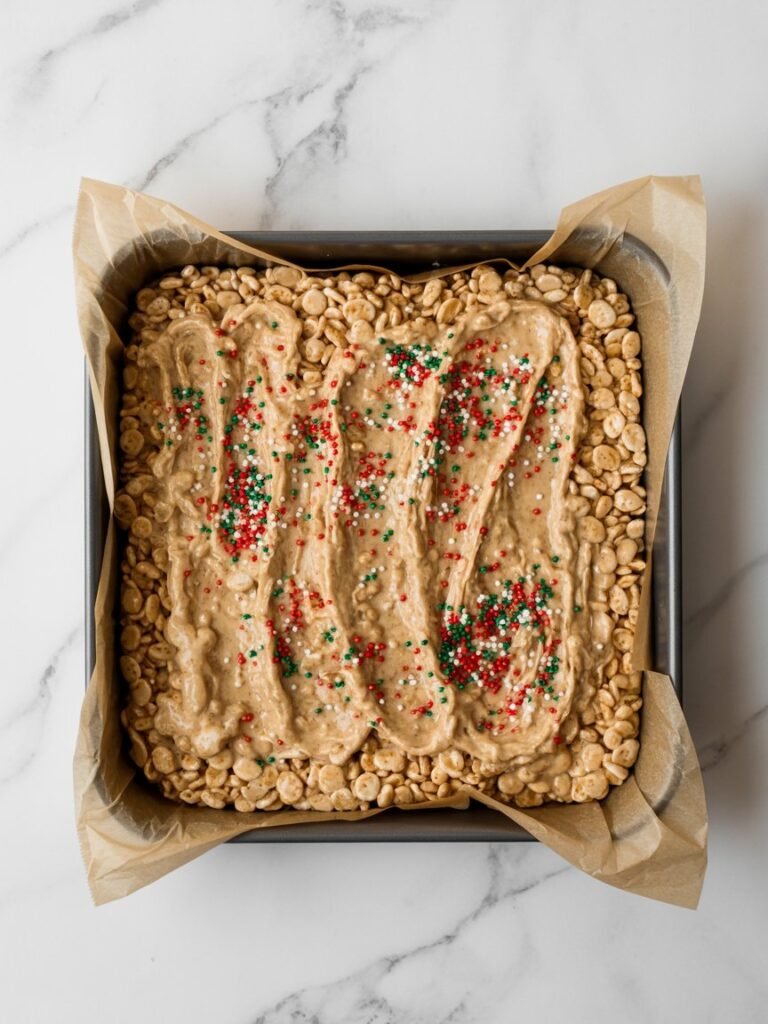 Add the cereal to the melted mixture. Fold gently with a silicone spatula until every piece is coated. Avoid smashing or pressing the cereal so the bars stay airy. - Add the Festive Mix-Ins