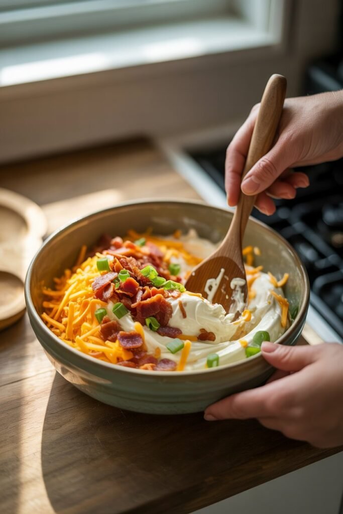 I like to mix it until it’s perfectly smooth and every bite will have a little bit of everything. Take a moment here and taste it—sometimes I add a touch more cheddar or green onion depending on how bold I’m feeling that morning.