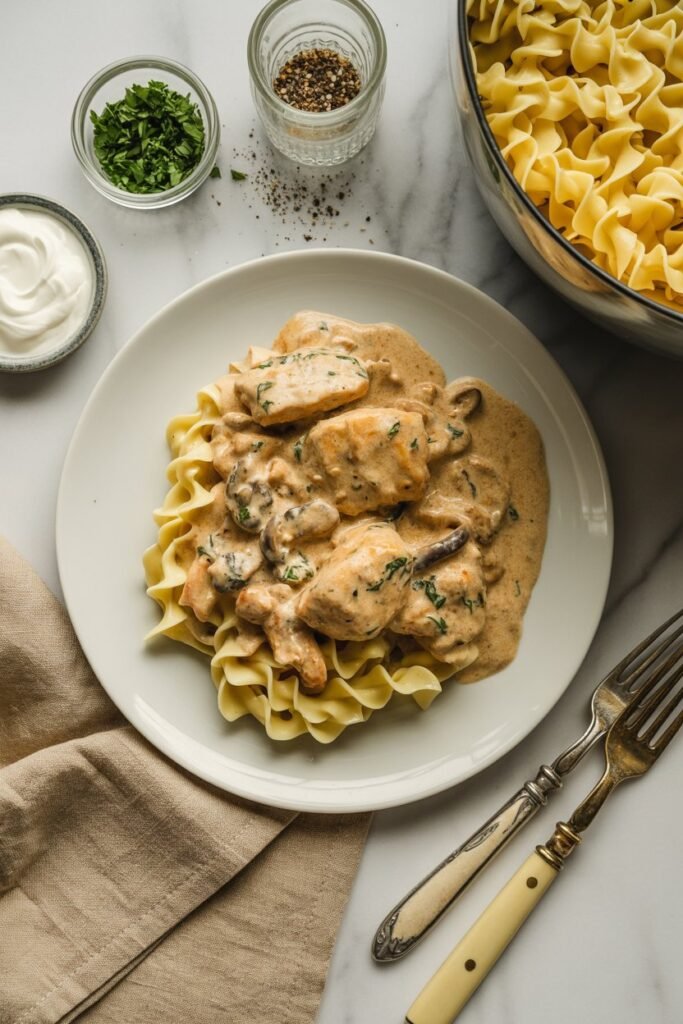 Spoon the creamy chicken stroganoff over a bed of egg noodles, rice, or mashed potatoes, letting the sauce drizzle over everything.