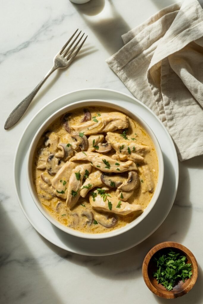 The sauce is rich and creamy, with just the right balance of savory flavors from mushrooms, garlic, and onions, and the chicken soaks it all up beautifully.