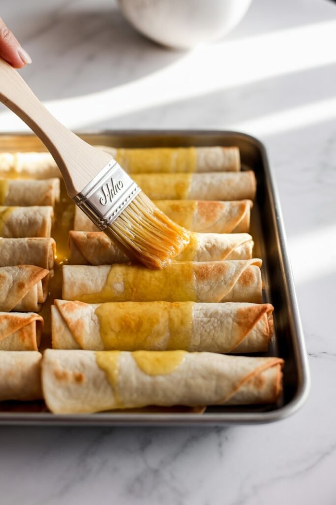 Brush each rolled taquito lightly with melted butter. This is what makes them golden and crispy.