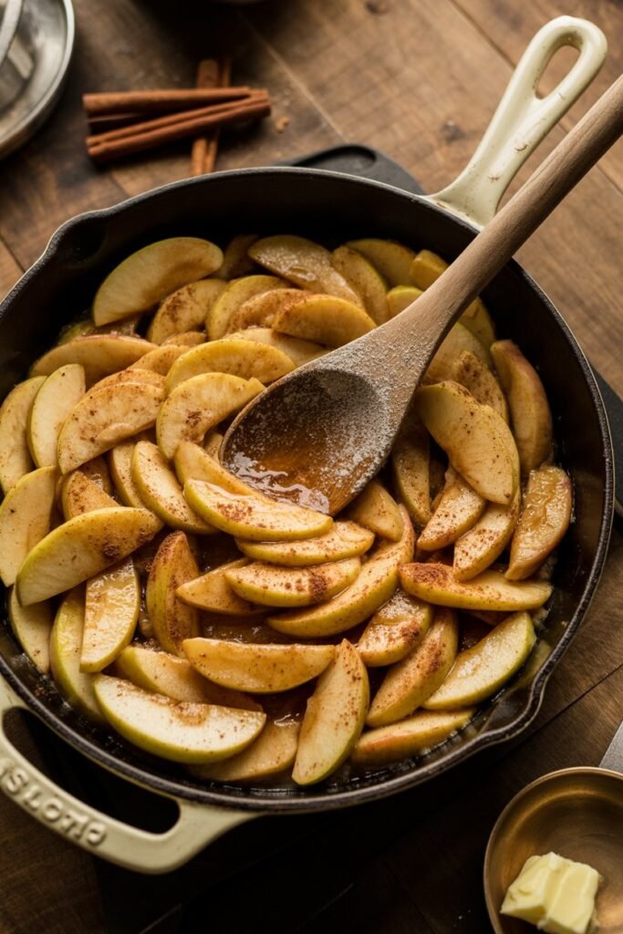 Add the diced apples, brown sugar, cinnamon, nutmeg, and lemon juice. Stir everything together and let the apples cook for about 5–7 minutes until they start to soften and release their juices.