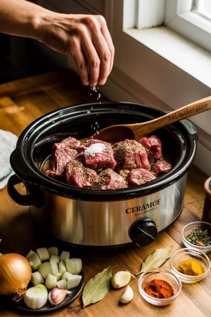 In your slow cooker, combine the seared or raw beef, diced onion, beef broth, cream of mushroom soup, onion soup mix, garlic powder, and a pinch of salt and pepper.