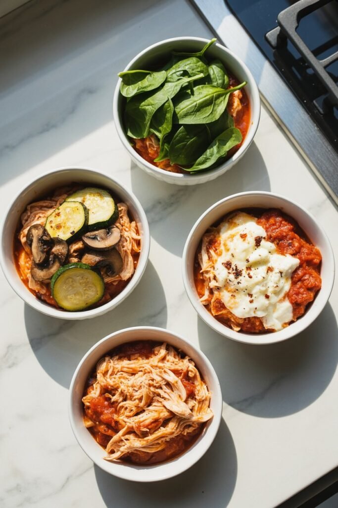 Sometimes I add vegetables to the bottom of the crockpot before placing the chicken on top. Sliced zucchini, mushrooms, or spinach work really well and cook perfectly in the sauce.