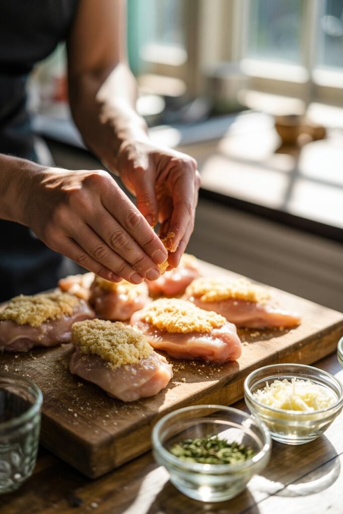 In a separate bowl, I beat the egg. I dip each chicken breast into the egg first, then press it into the breadcrumb mixture until it’s completely coated.