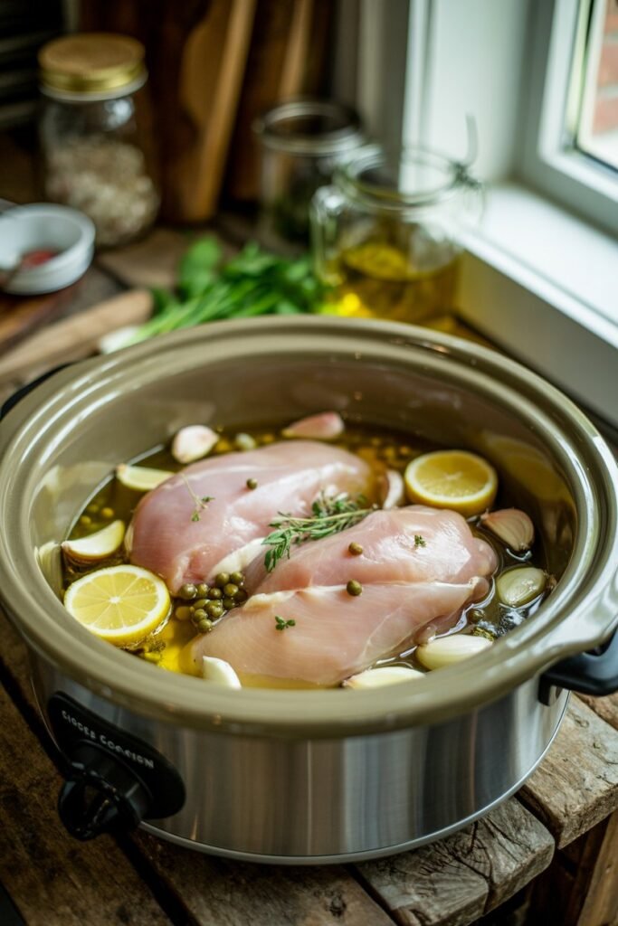 I place the chicken directly in the crockpot and layer on the flavor. I add minced garlic, diced onions, chicken broth, a splash of white wine if I have it, fresh lemon juice, and capers.