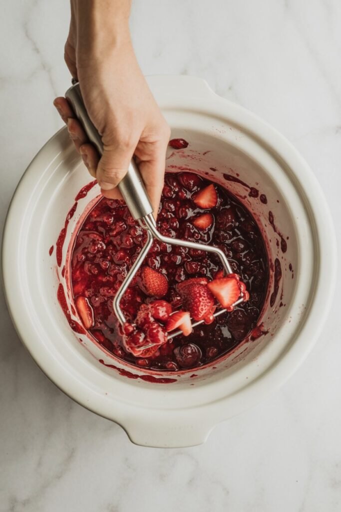 If you love jam that’s a little rustic and full of fruit, gently crush the berries with a potato masher — just enough to break them down while keeping some chunks for texture.