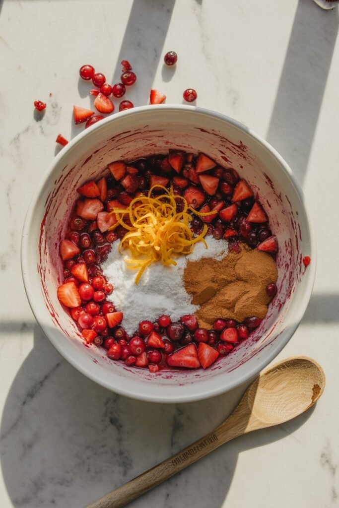 Let it sit for about 15 minutes — the fruit will start to release its juices, creating that beautiful ruby syrup base.