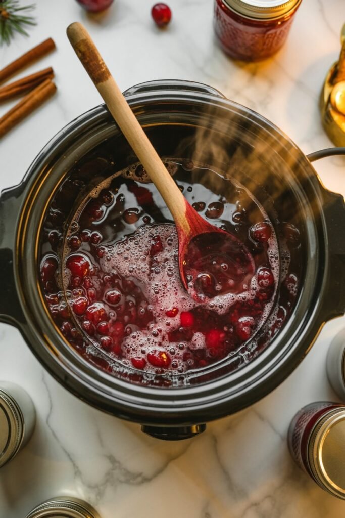 • Cover and cook on LOW for 4–5 hours, stirring every hour. The berries will soften and break down into a glossy, fragrant mixture.