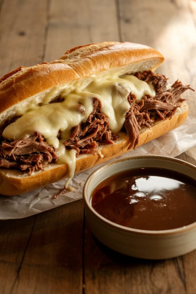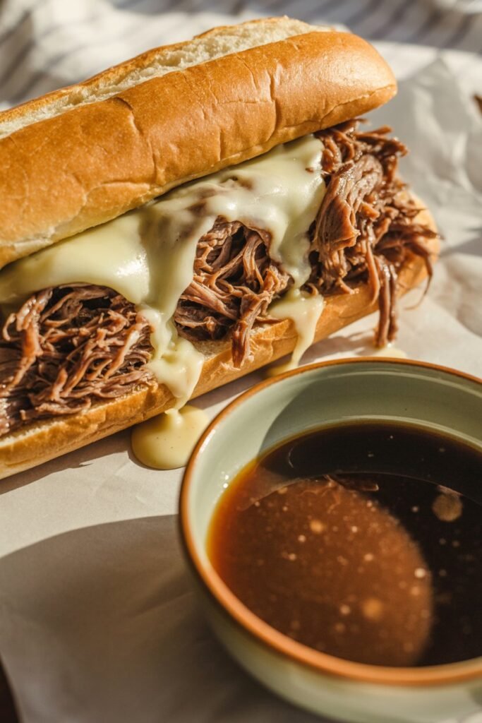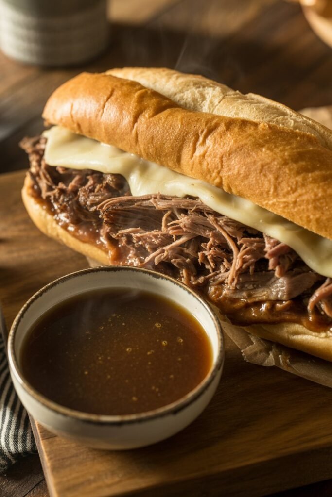 Ladle the hot au jus into small bowls for dipping. Serve immediately while the beef is juicy, the bread is warm, and the broth is rich and flavorful.