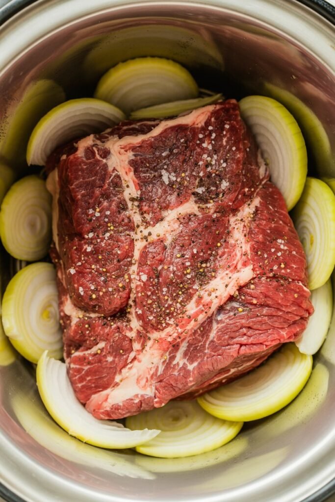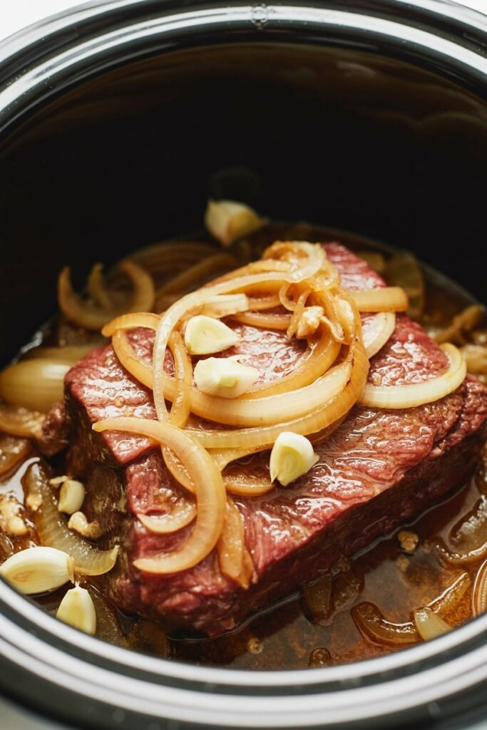 Spread the sliced onions evenly over the beef. As they cook, the onions soften completely and almost dissolve into the broth, creating a naturally rich base for the au jus.