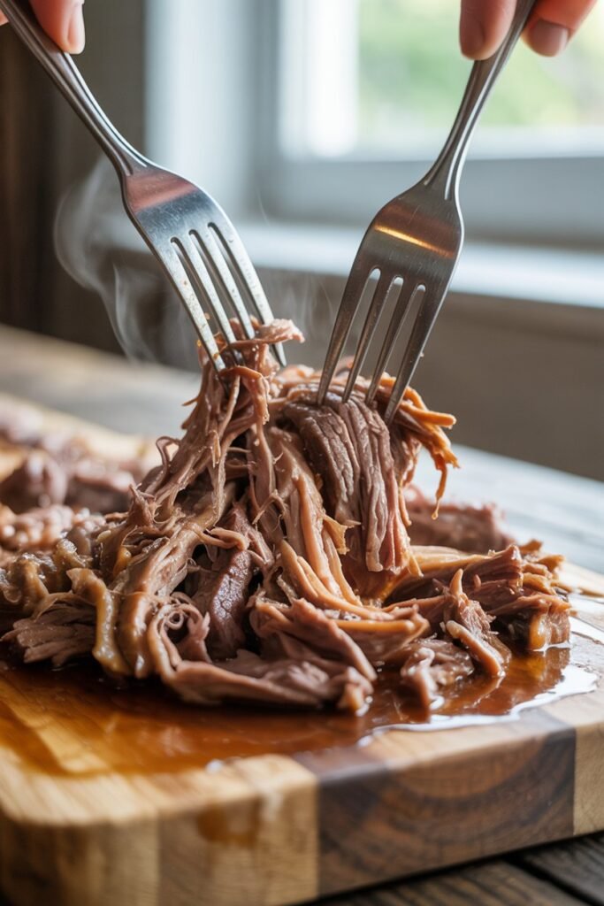 Return the shredded beef to the slow cooker and stir it gently into the broth. Let it rest in the liquid for 10 to 15 minutes so the meat fully absorbs the au jus flavor instead of just sitting on top of it.
