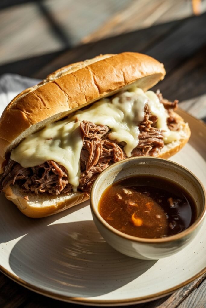 Pile the beef onto toasted rolls, add melted cheese, and dip it into that savory broth. It’s simple food done right.