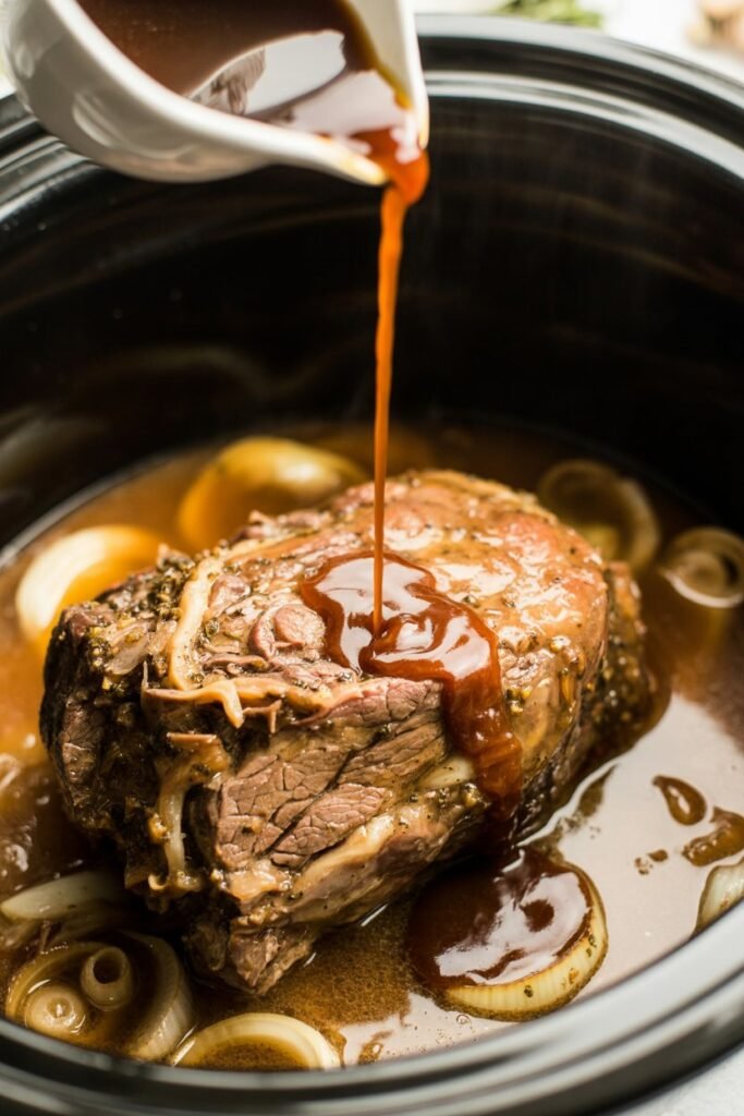 Slowly pour in the beef broth and French onion soup, allowing the liquid to flow around the meat rather than directly over it. This helps keep the seasoning balanced and prevents washing everything off the surface.