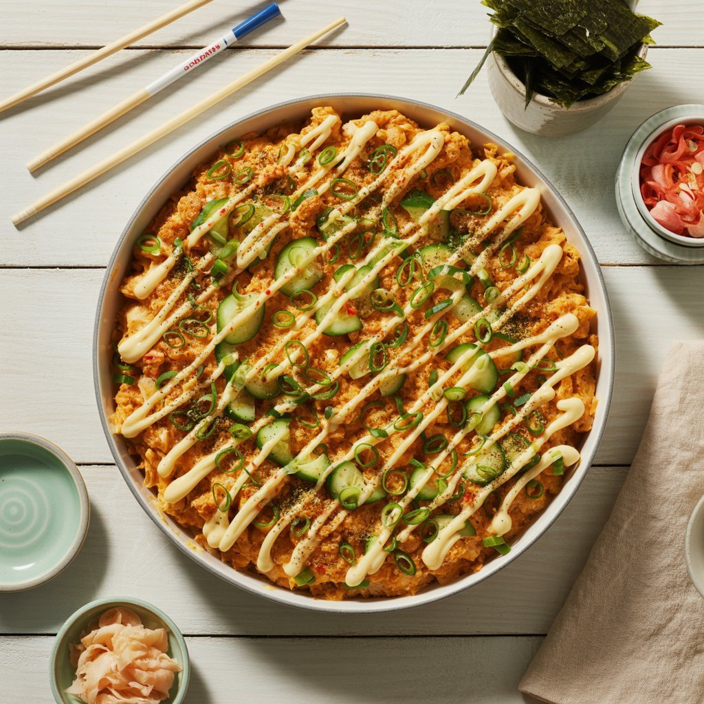 kcalA beginner-friendly Sushi Bake layered with seasoned sushi rice, creamy crab mix, furikake, and fresh toppings. This no-roll sushi casserole is perfect for weeknight dinners, parties, potlucks, meal prep, or anyone craving sushi flavors without the hassle.