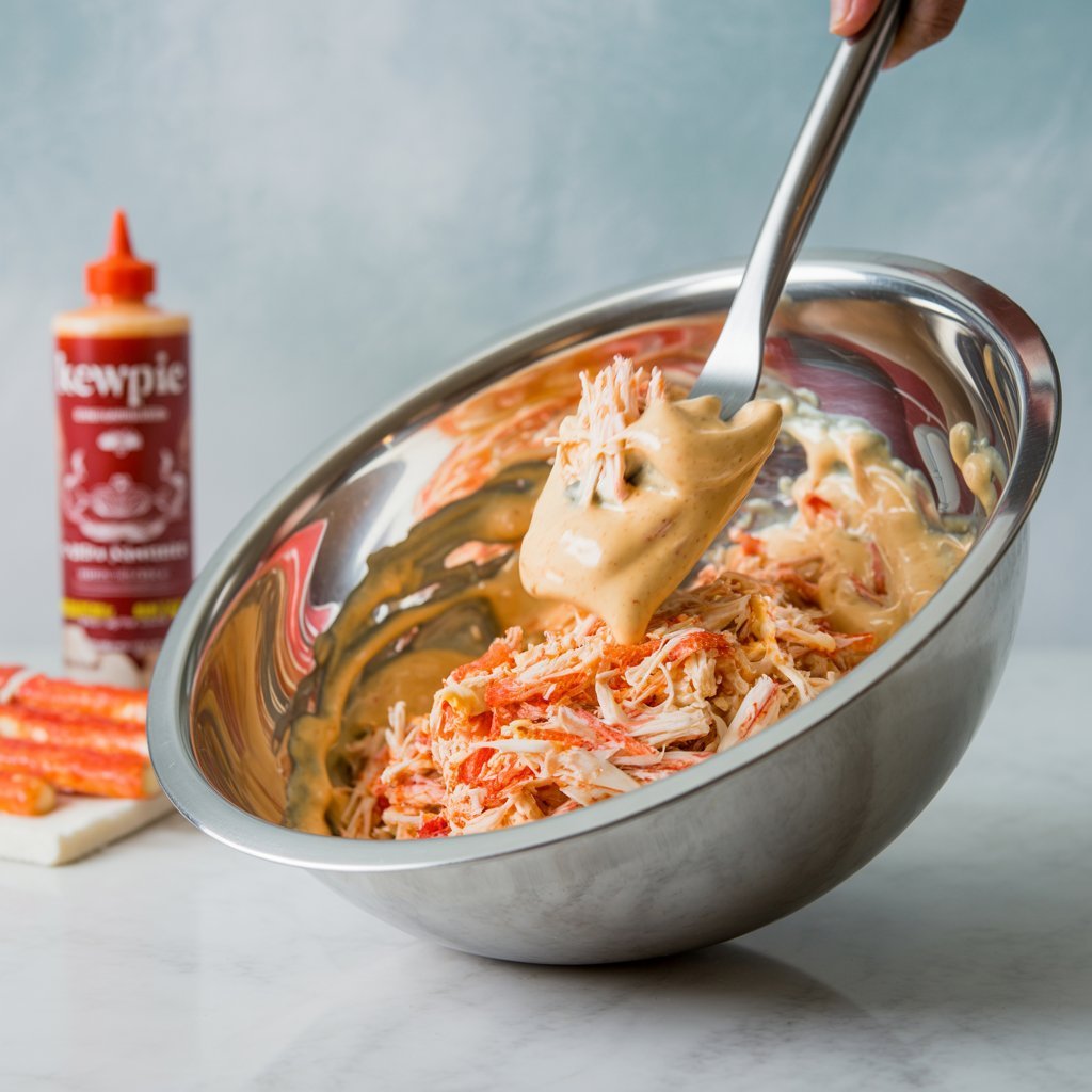 In a bowl, mix crab, Kewpie mayo, softened cream cheese, and sriracha until creamy and smooth.
