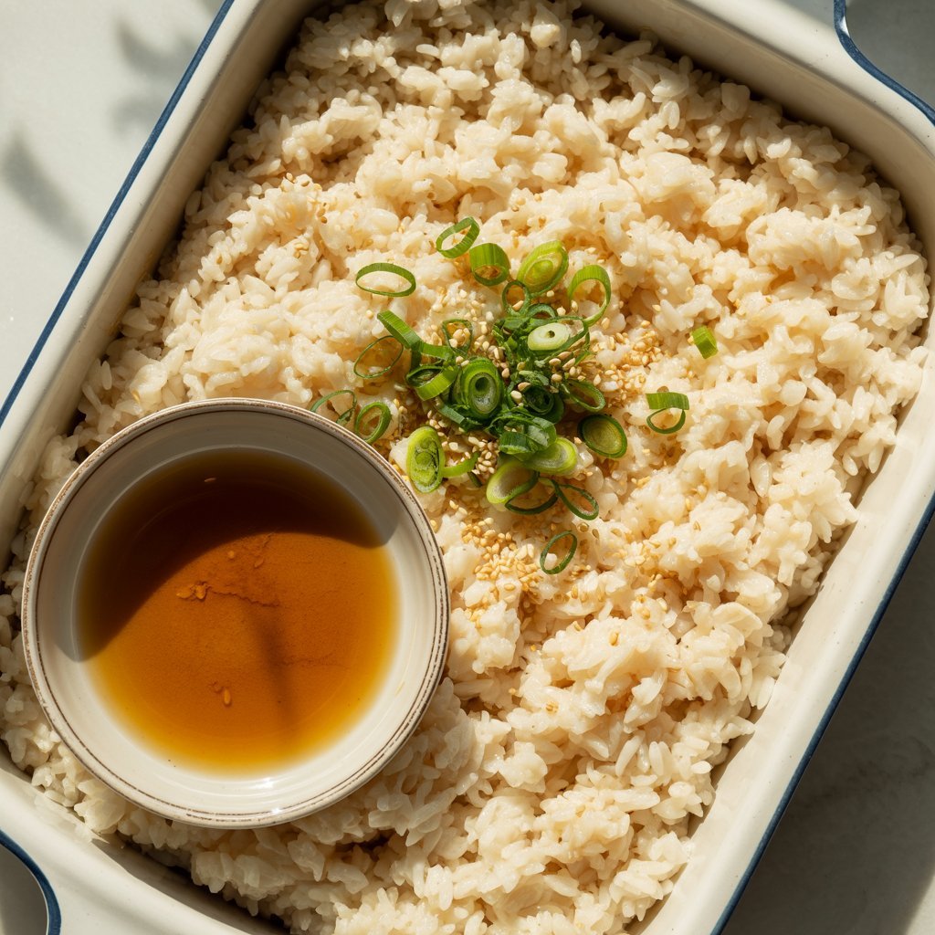Lightly grease a 9×13-inch baking dish, then spread the seasoned rice across the bottom to create an even layer. This will be the base of your sushi bake.