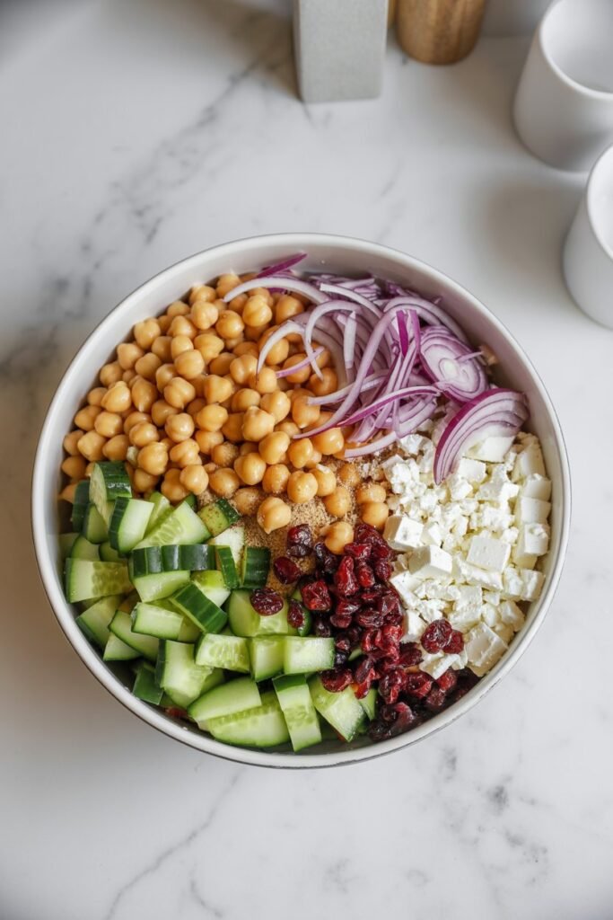 In a large bowl, gently mix chickpeas, cucumber, red onion, dried cranberries, and feta. I always wait to add the dressing until everything is combined because I want every ingredient coated evenly.